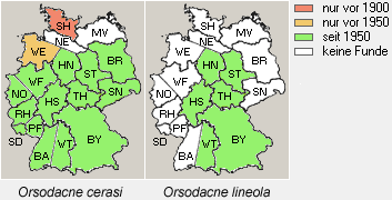 ![]() ![]() Abb. 2: Magerrasen am Südhang des Gangelsbergs. ![]() Die Gattung Orsodacne LATREILLE, 1802 enthält vier holarktisch vorkommende Arten, von denen zwei auch aus Deutschland gemeldet sind, nämlich die weit verbreitete und häufige Orsodacne cerasi (LINNAEUS, 1758) und die ungleich seltenere Orsodacne lineola (PANZER, 1795). Orsodacne cerasi wurde 1998 aus praktisch allen Regionen Deutschlands mit Ausnahme des Nordens (Weser-Ems-Gebiet, Niederelbe, Schleswig-Holstein und Mecklenburg-Vorpommern) mit Nachweisen nach 1950 gemeldet (KÖHLER & KLAUSNITZER 1998, Abb. 3). Einen Erstnachweis für Mecklenburg-Vorpommern melden DRILLING & KLAAS (2008). ![]()