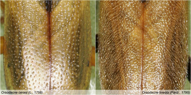 ![]() Beide Arten sind recht farbvariabel: Von einfarbig gelben bis zu vollkommen schwarzen Exemplaren sind alle Übergänge vorhanden. Die Unterscheidung der beiden in Deutschland vorkommenden Arten ist leicht über die Punktierung und Behaarung der Flügeldecken möglich (s. MOHR 1966): Bei Orsodacne cerasi sind die Elytren völlig unbehaart und wenig dicht punktiert, bei O. lineola hingegen zart und anliegend mit weißen Härchen besetzt und dichter, um die Flügeldeckennaht etwas gedrängt punktiert (Abb. 4). Orsodacne lineola lebt polyphag an Baum- und Strauchrosaceen, z.B. Weißdorn (Crataegus), Mispel (Mespilus), Birne (Pirus) und Kirsche (Prunus). ![]() Abb. 4: Scheibe der Flügeldecken von Orsodace cerasi und Orsodacne lineola. ![]() Literatur DRILLING, K. & K.-D. KLAAS (2008): Orsodacne cerasi (Coleoptera, Orsodacnidae): Neufund für Mecklenburg-Vorpommern. – Entomologische Nachrichten und Berichte (Dresden) 52: 219–220. KÖHLER, F. & B. KLAUSNITZER (1998): Verzeichnis der Käfer Deutschlands. – Entomologische Nachrichten und Berichte (Dresden) Beiheft 4: 1–185. MOHR, K. H. (1966): Familie Chrysomelidae; in: FREUDE, H., K. W. HARDE & G. A. LOHSE, (Hrsg.): Die Käfer Mitteleuropas, Bd. 9, Krefeld, 95–280. REICHERT, H. (2001): Bericht zur Frühjahrs-Exkursion des Pollichia-Hauptvereins am Gangelsberg bei Duchroth/Nahetal am Sonntag, 27.05.2001 (pollichia.de). ![]()