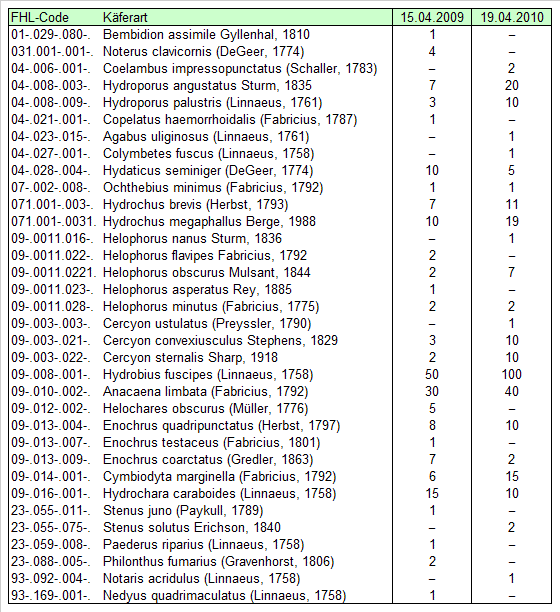 Tab. 1: Artenspektrum bei zwei Probenahmen im Hydrochus