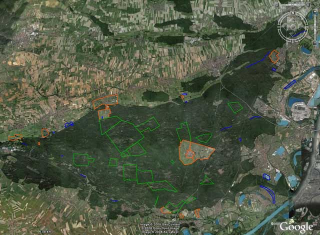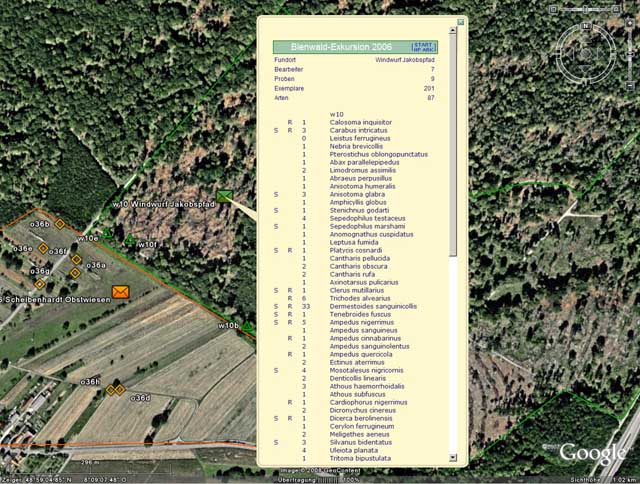 Zum Bienwald-Projekt gibt es jetzt eine Google-Earth-Datei (90kb) mit den Abgrenzungen der bisherigen Untersuchsflächen nebst Biotopfotos aus den Jahren 2006 bis 2008 sowie den Artenlisten des Jahres 2006. Einfach die Datei anklicken und damit das Programm starten, ins Satellitenbild reinzoomen und dann in den Bildern und Dateien schmökern. Vorraussetzung ist natürlich, dass das kostenlose, 17 MB große Programm Google Earth installiert ist. Das Update vom 4.06.2009 enthält neue Gebietsabgrenzungen und Fotos, die der Übersichtlichkeit halber in einem separaten Ordner oben in der Ordnerstruktur stehen. Ein Update der Artenlisten ist in Vorbereitung. Achtung: Unter Windows Vista können Ladeverzögerungen in den Artenlisten entstehen. Nach einer Problemlösung wird gesucht. Stufenlos aus der Satellitenumlaufbahn