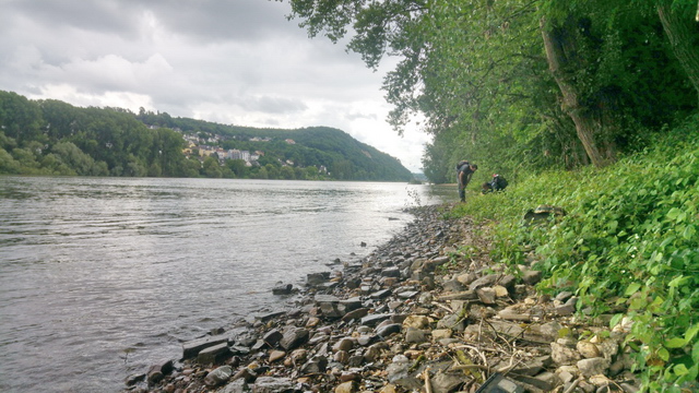 Abb. 1: Auf der Suche nach ripicolen Käfern an einem steinigen Ufer auf der Rheininsel Niederwerth. Am Folgetag erschienen bei strahlendem Sonnenschein deutlich mehr Teilnehmer, so dass sich zwei Gruppen mit unterschiedlichen Exkursionszielen bildeten. Jetzt wurde die Rheinhalbinsel Oberwerth (Abb. 2 und 4) aufgesucht und die zweite Gruppe brach erneut nach Niederwerth auf. Am frühen Nachmittag kamen dann alle Exkursenten noch einmal auf der Rheininsel Weißenthurmer Werth zusammen, wo bereits nach den ersten Schritten einige bemerkenswerte Käferarten nachgewiesen werden konnten.