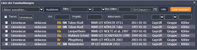 zeigt im Moment Gattung, Art, Region, Naturraum, Ortsangabe, Datenprojekt,